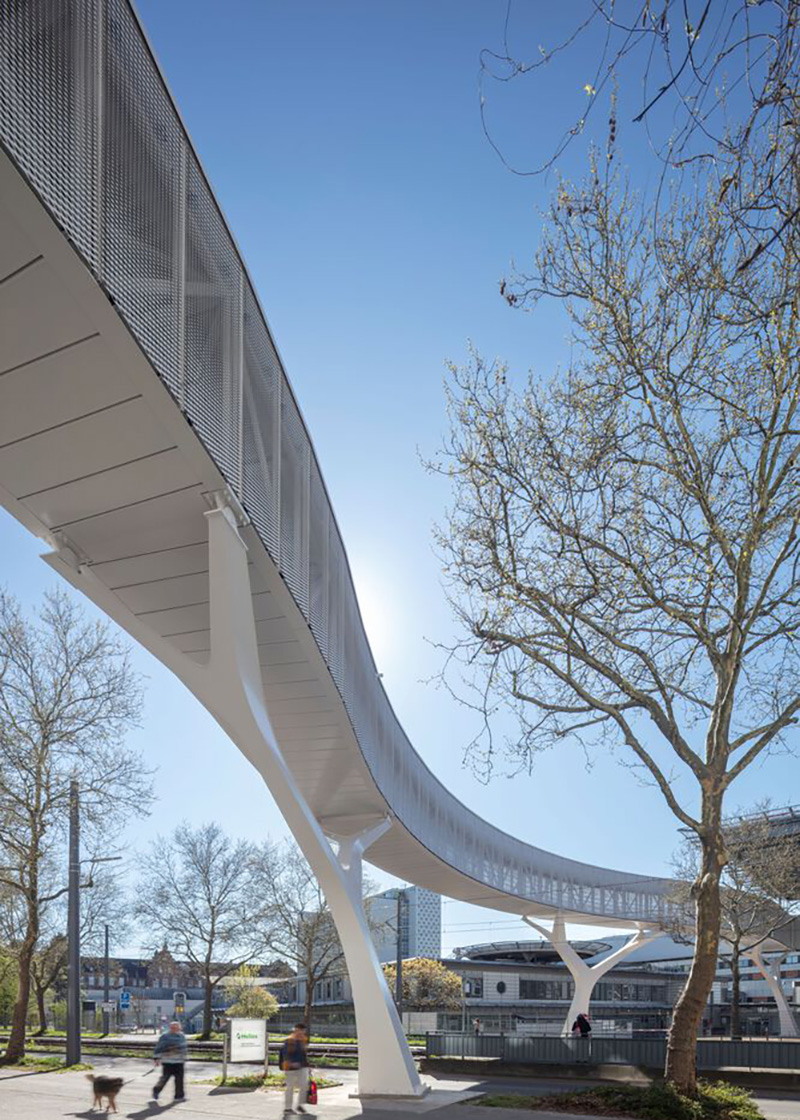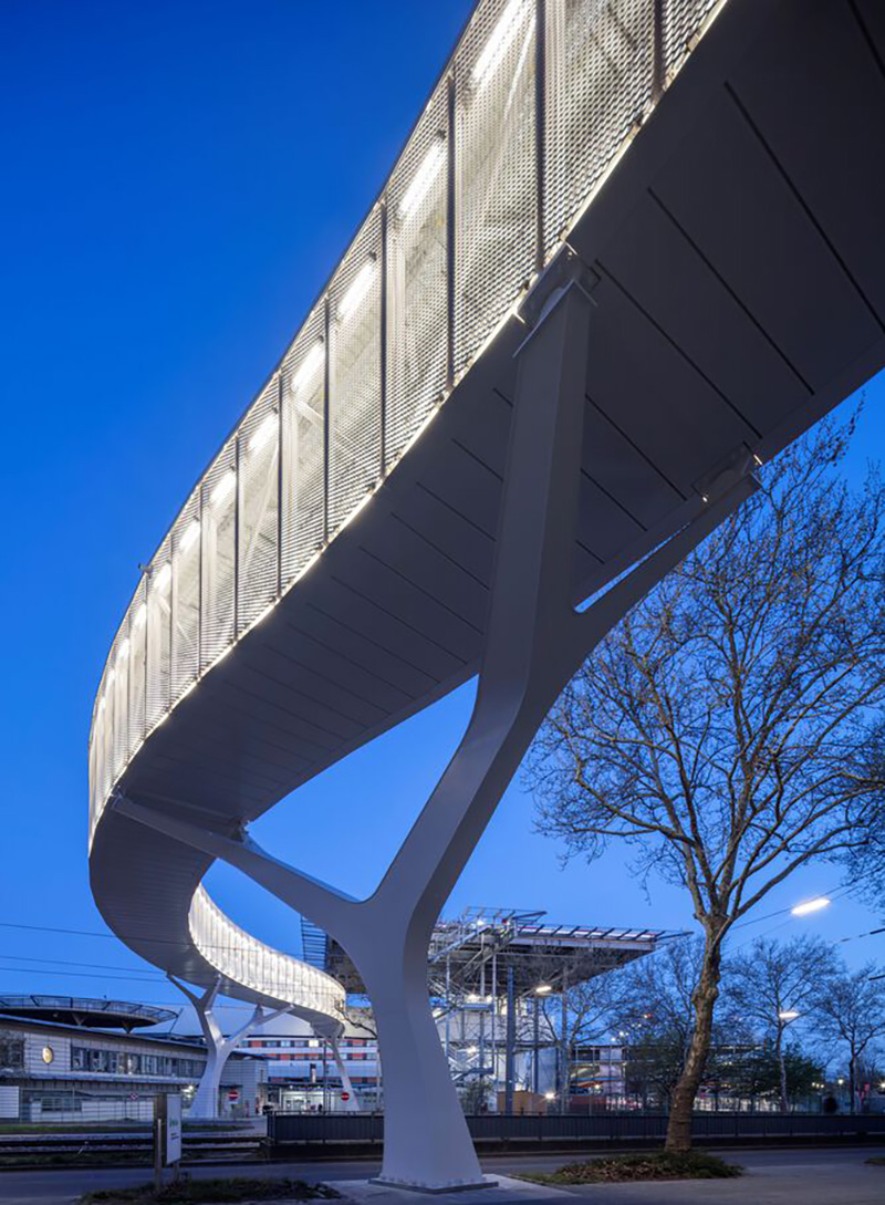 这座 80 米长的曲线天桥以柔和弧度跨越弗朗茨-卢斯特街(Franz-Lust-Strasse)的四车道及中央有轨电车轨道。街道两侧采用分叉式立柱设计,宽幅悬臂与悬铃木行道树融为一体;停机坪前方增设独立支柱。