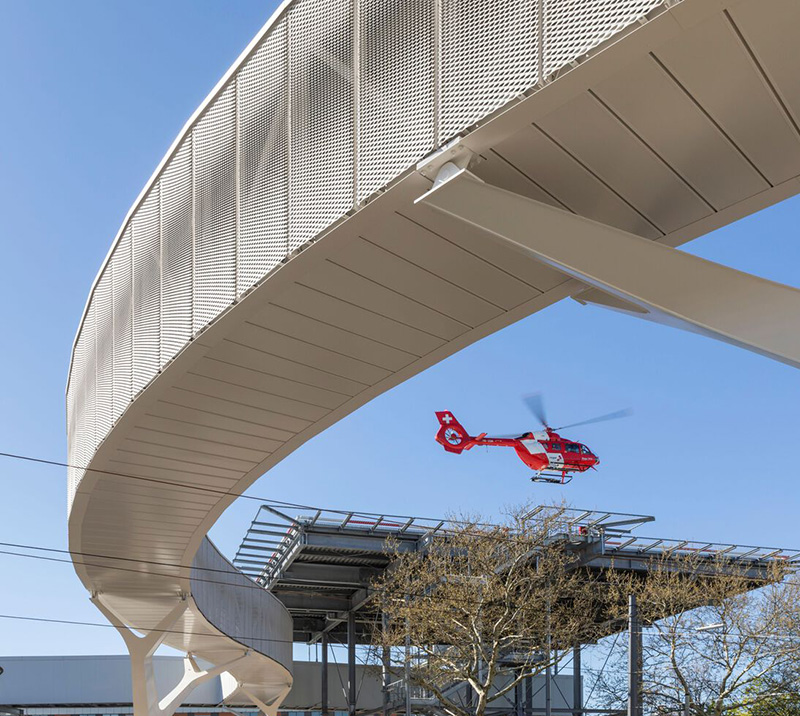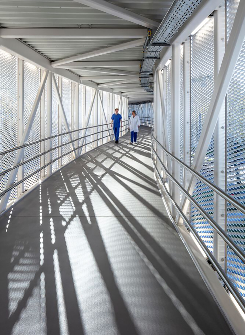 动态的桥梁铝拉网板造型与城市肌理完美契合,避免了突兀感,成为繁忙交通区域中连接两所医院的关键纽带。其设计语言既保持功能性,又通过建筑韵律展现城市活力,使基础设施转化为具有人文温度的城市景观。